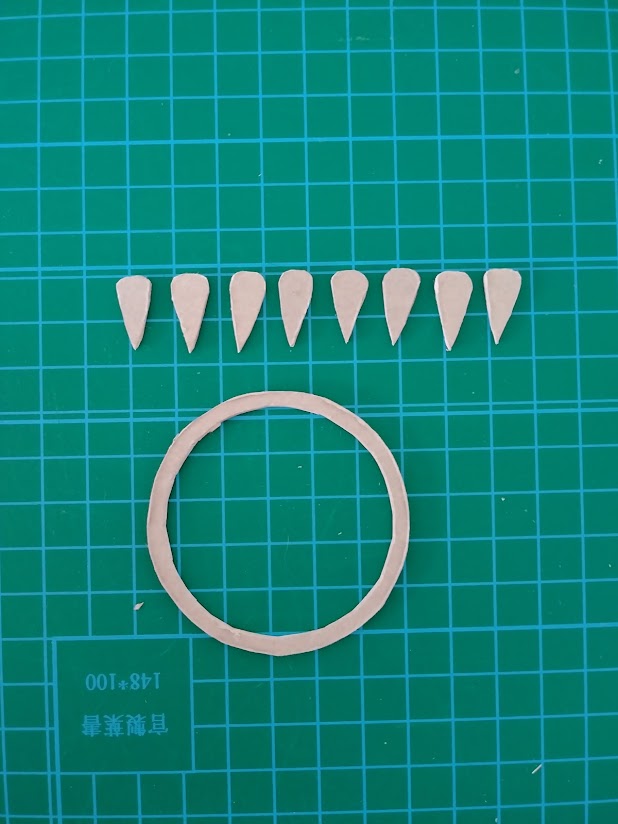 ②くり抜いた円の余りの部分内側0.5㎜に円を描き外側1㎝の種を8個描きカットしていきます。